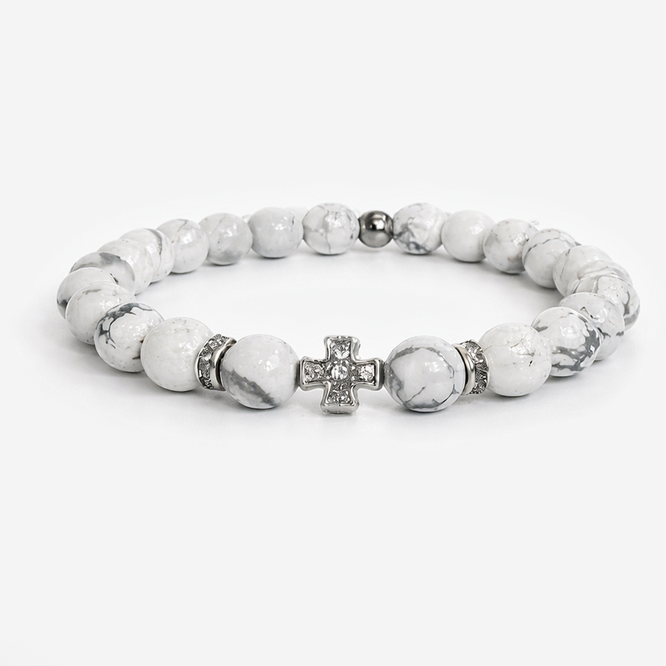 Православный браслет Гавлит — элегантное украшение из натурального камня благородного белого цвета с изящными серыми прожилками. Чистота белого напоминает о нетленной красоте святости и свете Крещения. Камень дарит умиротворение, располагает к молитве и душевной тишине. Универсальный дизайн гармонично дополнит любой образ. Натуральный камень, эластичная нить, универсальный размер.