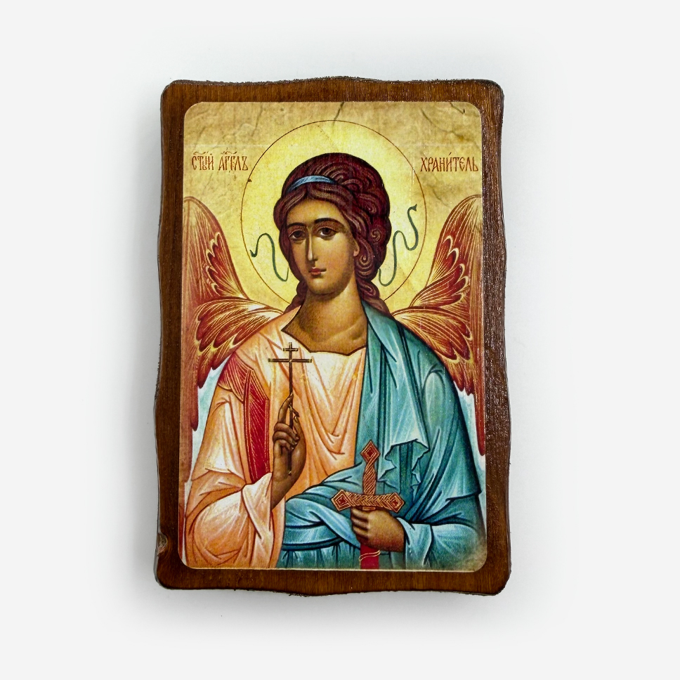 Икона на дереве «Ангел Хранитель» — образ небесного покровителя, даруемого каждому человеку при Крещении. Натуральный деревянный спил с живой текстурой создает ощущение тепла и защиты. Ангел всегда рядом, наставляет на добро и ограждает от зла. Освящена. Икона подходит для детской комнаты или личного иконостаса, станет трогательным подарком ребенку или крестнику.
