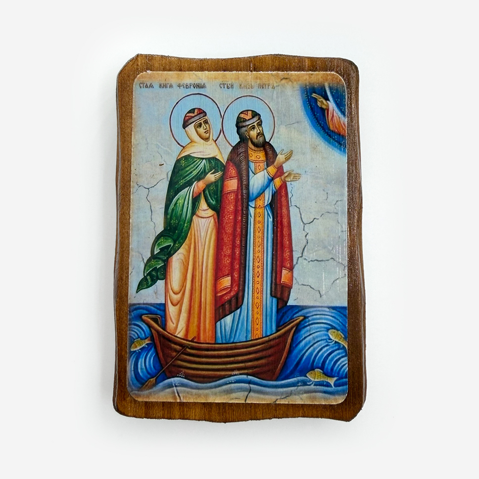 Икона на дереве «Святые Петр и Феврония» — образ покровителей семьи, любви и верности. Выполнена на натуральном деревянном спиле с сохранением природной текстуры. Теплый материал подчеркивает трогательность образов муромских чудотворцев. Икона освящена, подходит для домашнего иконостаса или подарка молодоженам. Лаконичный дизайн без лишнего декора.