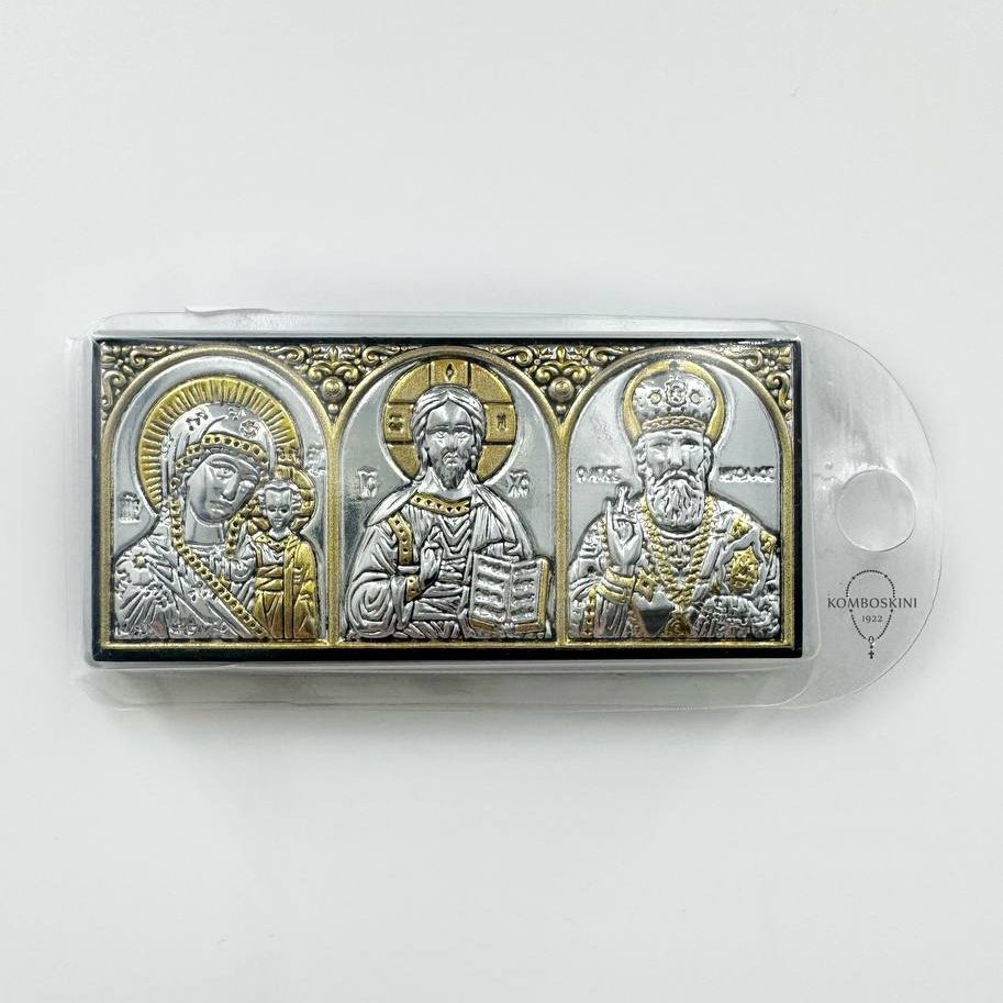 Триптих Silver Axion — изящная икона с посеребрением, объединяющая три святых образа. Раскрывается как молитвенный покров в дороге и дома. Четкая рельефная икона, благородный блеск серебра, компактный размер для ношения при себе или размещения в автомобиле. Достойное убранство для святого угла. Освящено. Благословение Господне да пребудет с вами.