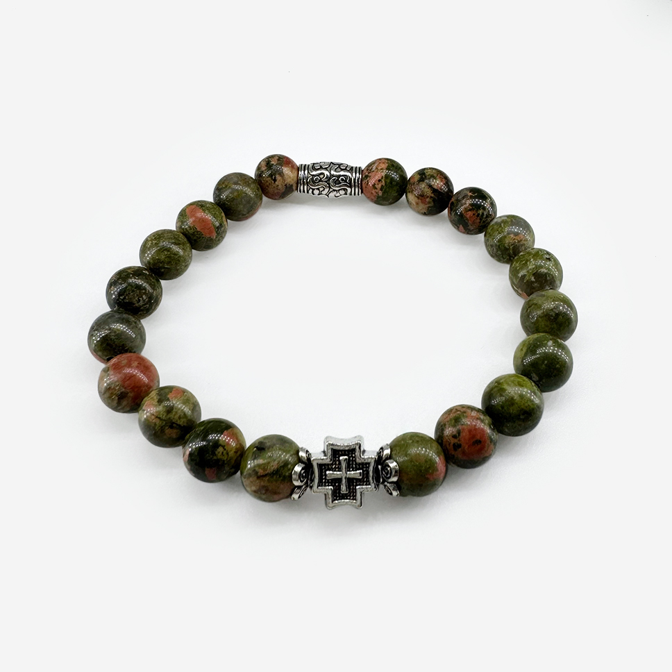 Православный браслет «Унакит» — украшение из натурального камня с уникальным рисунком, сочетающим красные и зеленые оттенки. Красный цвет напоминает о любви и чистоте Пресвятой Богородицы, зеленый — о вечной жизни и обновлении души. Камень дарит душевный мир и радость созерцания красоты творения. Натуральный камень, эластичная нить, универсальный размер.