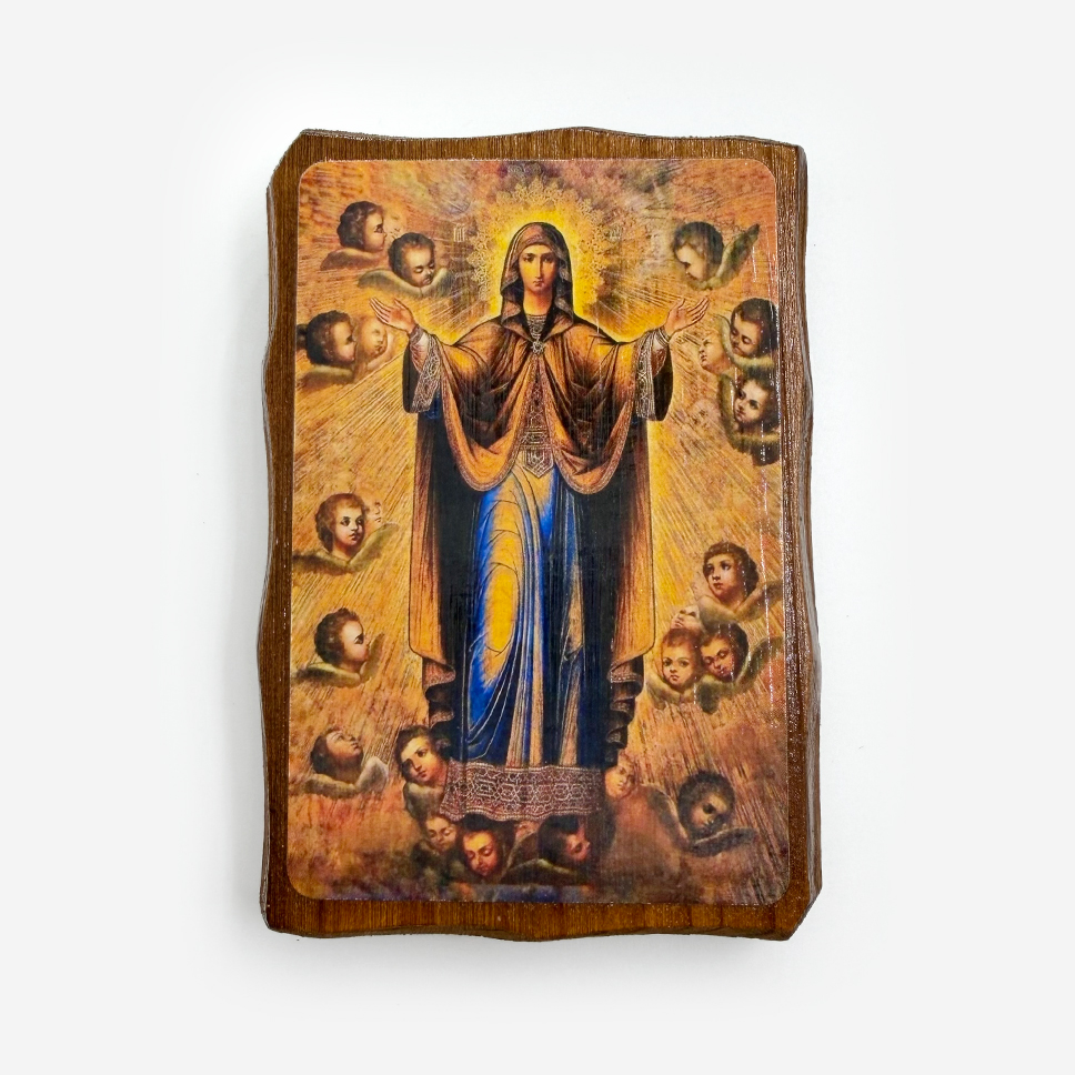 Икона на дереве «Богородица Нерушимая стена» — образ Пресвятой Богородицы, символизирующий Ее несокрушимую защиту и заступничество. Названа так потому, что Богородица, словно нерушимая стена, ограждает верующих от бед, врагов и напастей. Натуральный деревянный спил с живой текстурой придает иконе теплоту и древнюю мощь. Освящена. Хранительница дома, семьи и всякого начинания.