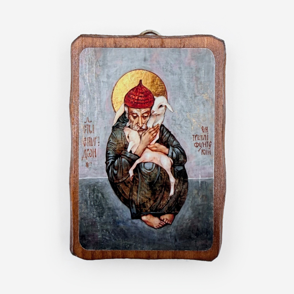 Икона «Святитель Спиридон Тримифунтский с овечками» — трогательный образ великого чудотворца, пастуха и защитника стада. Святой изображен с овечками, напоминая о его простом происхождении и пастырской заботе о пастве. Натуральный деревянный спил с живой текстурой подчеркивает теплоту и близость этого образа. Освящена. Прекрасный подарок для пастухов, фермеров и всех, кто ищет заступничества святого в житейских нуждах.