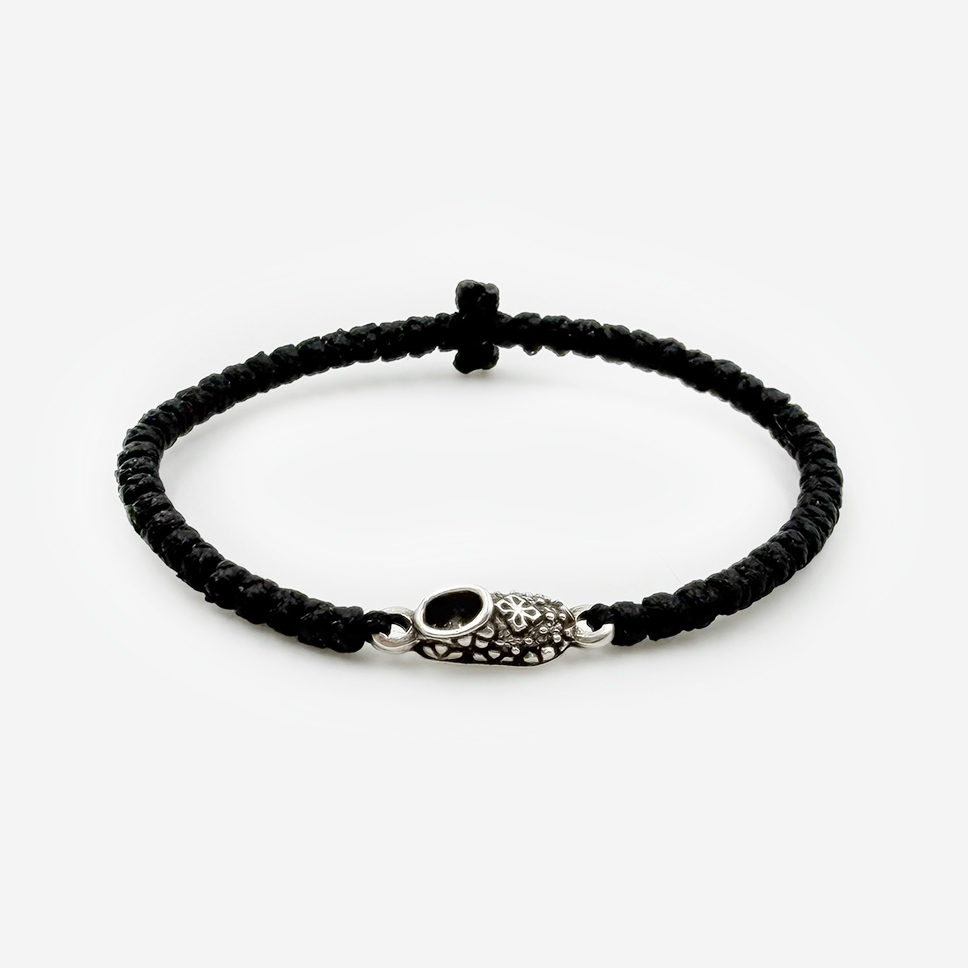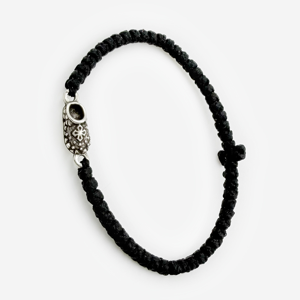 Комбоскини чёрный с серебряным башмачком — афонские четки (узелки) из прочной черной нити, увенчанные миниатюрным золотистым башмачком. Башмачок — символ святителя Спиридона Тримифунтского, чьи бархатные башмачки чудесным образом изнашиваются в помощи нуждающимся. Чётки помогают сосредоточиться на молитве, отсчитывать «Господи, помилуй». Компактный размер, удобно носить с собой.