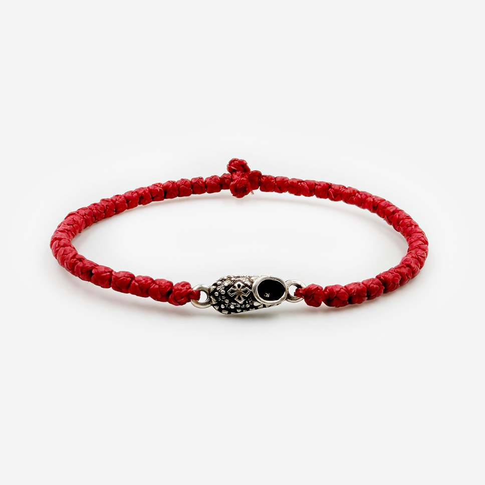 Комбоскини красный с серебряным башмачком — афонские четки (узелки) из прочной красной нити, увенчанные миниатюрным серебристым башмачком. Башмачок напоминает о святителе Спиридоне Тримифунтском, чьи бархатные башмачки чудесным образом изнашиваются, пока святой спешит на помощь. Чётки помогают сосредоточиться на молитве, отсчитывать «Господи, помилуй». Компактные, удобно носить с собой.