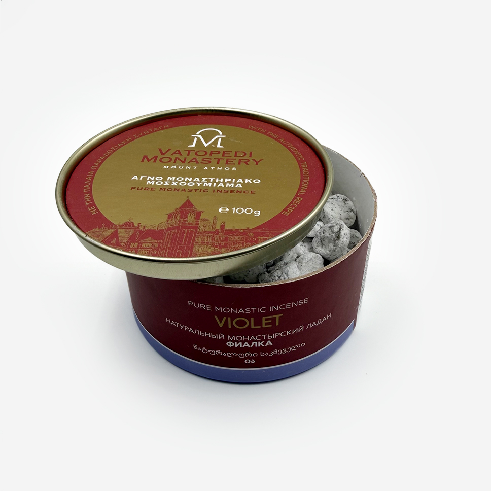 Ладан Ватопедский «Фиалка» — изысканное благовоние, изготовленное вручную монахами монастыря Ватопед на Афоне . Создан из смолы высочайшего качества с добавлением эфирных масел . Аромат — мощный, богатый и сложный, слегка дымный и сладкий, праздничный и торжественный . Обладает насыщенным и устойчивым запахом, не растекается на угле . Освящен в Великой обители Ватопед.