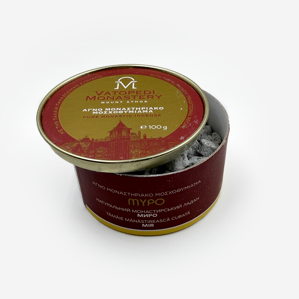 Ладан Ватопедский «Миро» — великое благовоние Великой обители Ватопед. Изготовлен вручную афонскими монахами из отборной смолы с добавлением натуральных эфирных масел, имитирующих аромат священного Мира. Торжественный, смолистый, глубокий и благодатный запах напоминает о Таинстве Миропомазания. Не растекается на угле. Освящен.