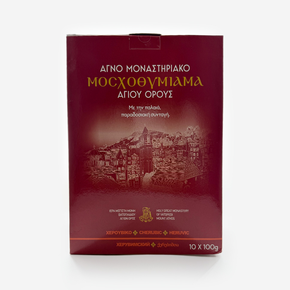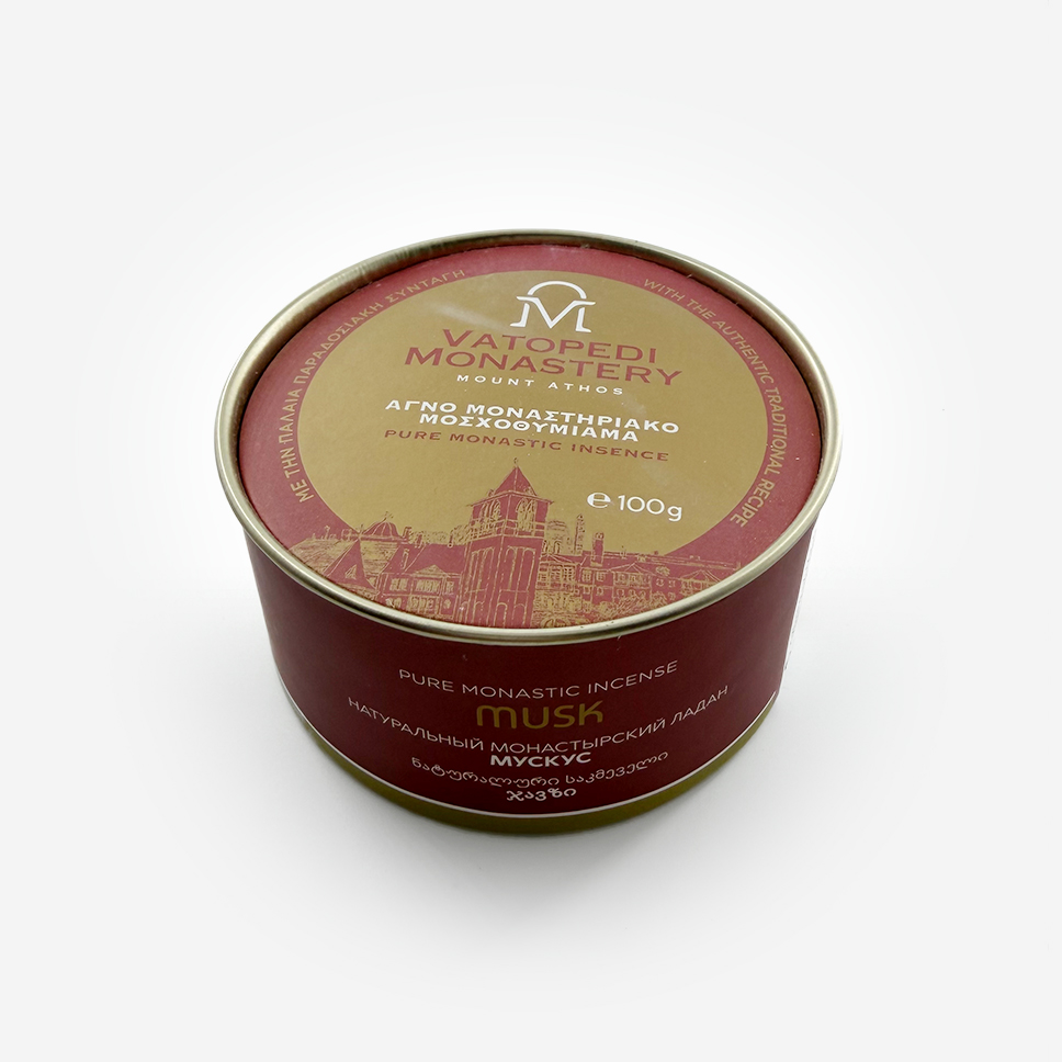 Ладан Ватопедский «Мускус» — великое благовоние, изготовленное вручную монахами обители Ватопед на Афоне по старинной рецептуре . Создан из смолы высочайшего качества и смеси натуральных эфирных масел . Аромат — мощный, богатый и сложный, слегка дымный и сладкий, с благородными пряными нотами и оттенками мускуса . Праздничный и торжественный . Обладает насыщенным и устойчивым запахом, не растекается на угле и не дает запаха гари . Освящен в Великой обители Ватопед. Подходит для храмового каждения и домашней молитвы.